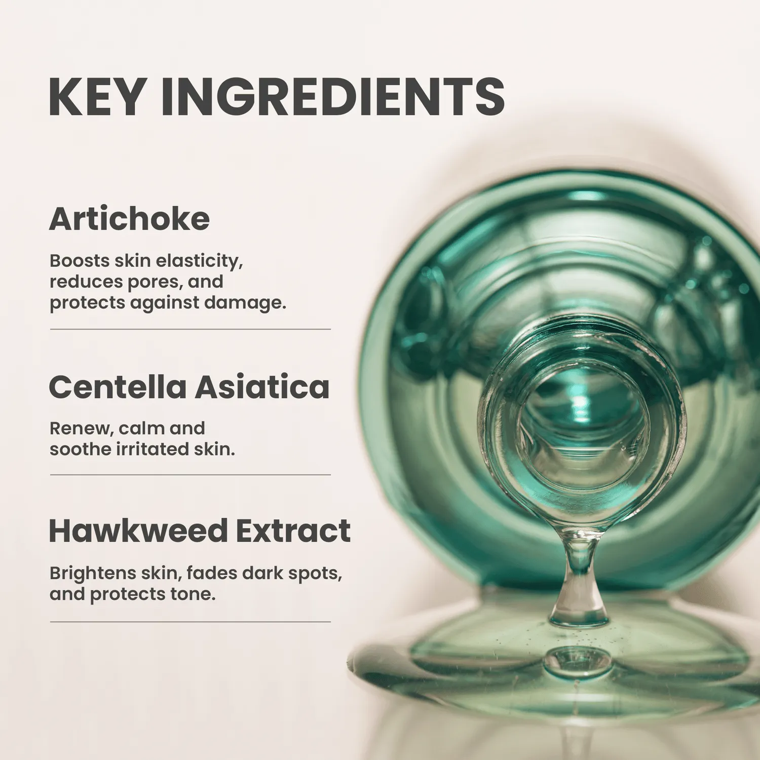 • Strengthens the skin barrier: artichoke extract protects with antioxidants, vitamins, and minerals