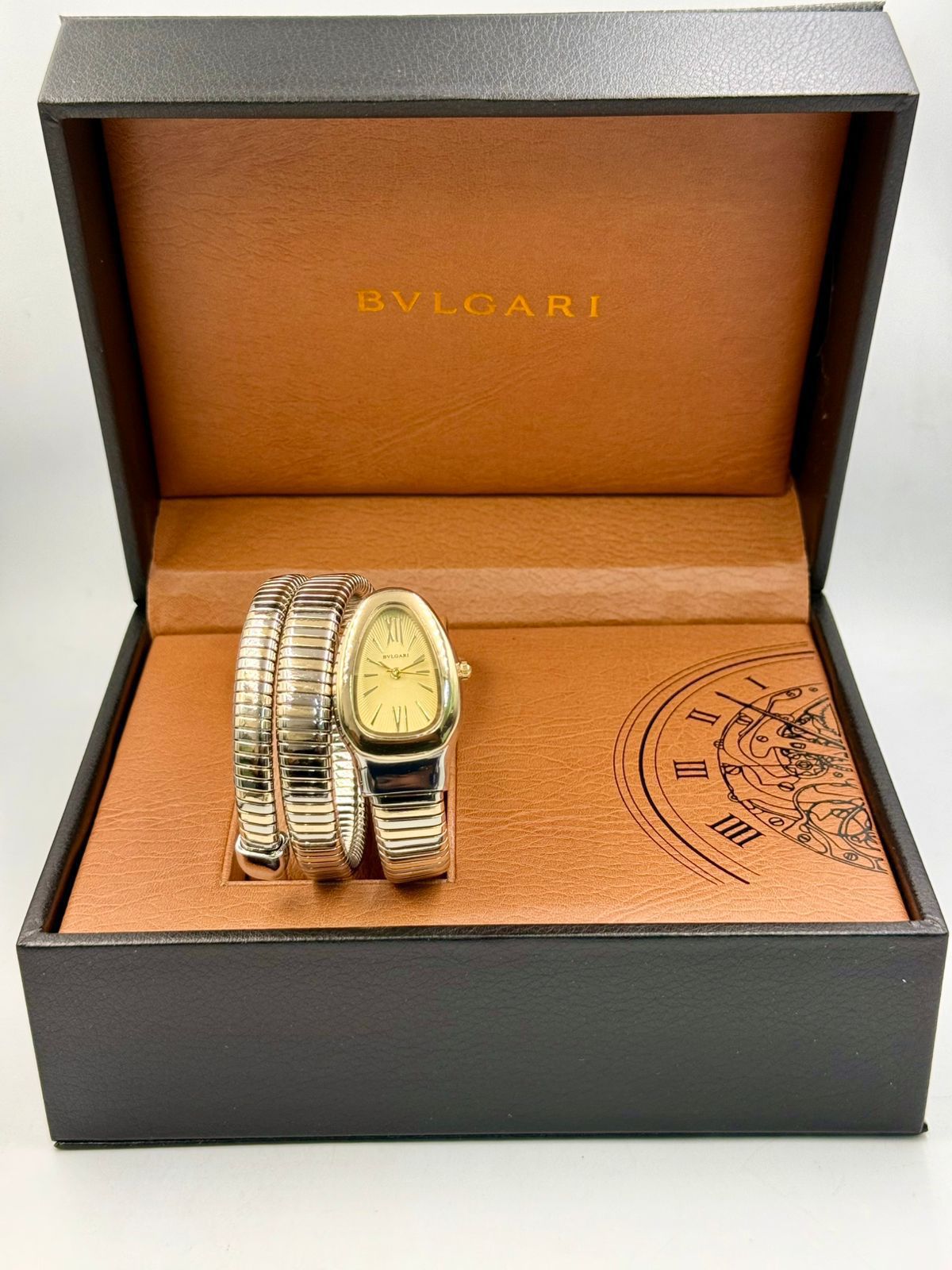This Bvl.gari watch features the signature spiral bracelet that wraps comfortably around the wrist. The curved case frames a dial with Roman numerals and slim hands, combining jewelry-inspired design with everyday timekeeping. Crafted using the Tubogas technique, it offers a flexible and sculptural look.