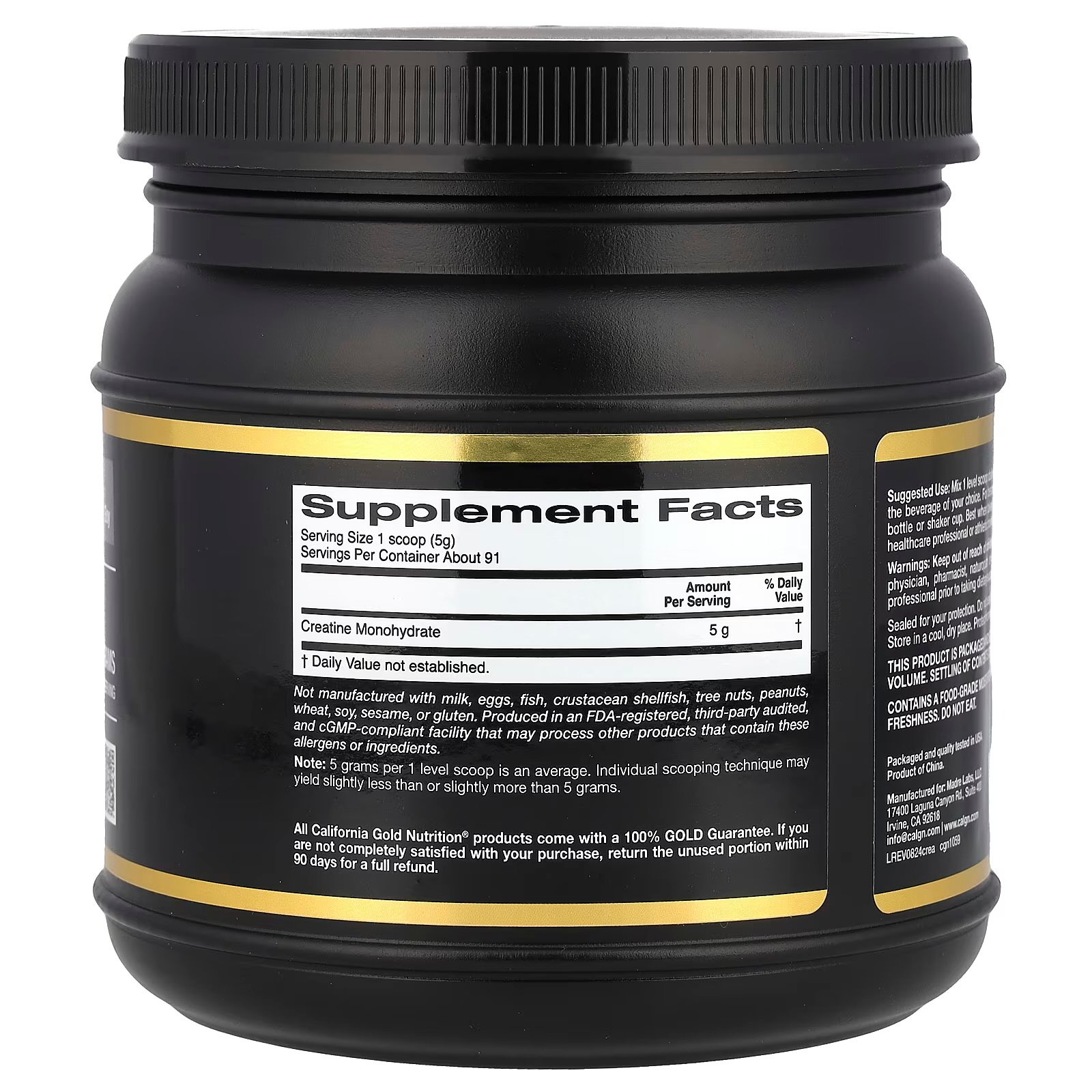 Not manufactured with milk, eggs, fish, crustacean shellfish, tree nuts, peanuts, wheat, soy, sesame, or gluten. Produced in an FDA-registered, third-party audited, and cGMP-compliant facility that may process other products that contain these allergens or ingredients.