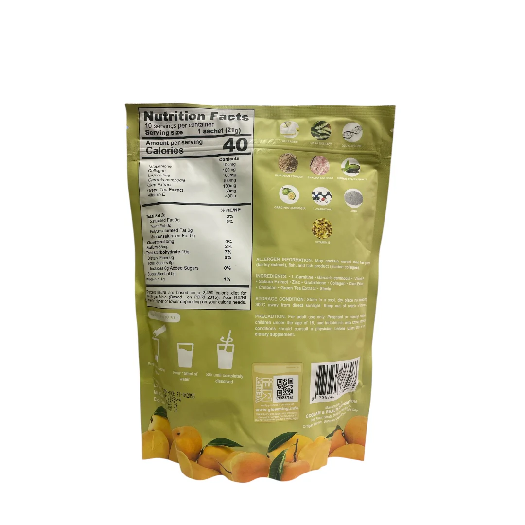 Cris Cosmetics Glowming Shape Milky Mango Glutathione & Collagen Drink is a perfect blend of nature and science, providing a myriad of benefits for your skin and overall health. With its unique combination of active ingredients, this drink is designed to help you shine from the inside out. Elevate your beauty routine and embrace a healthier lifestyle with this delicious drink today!
