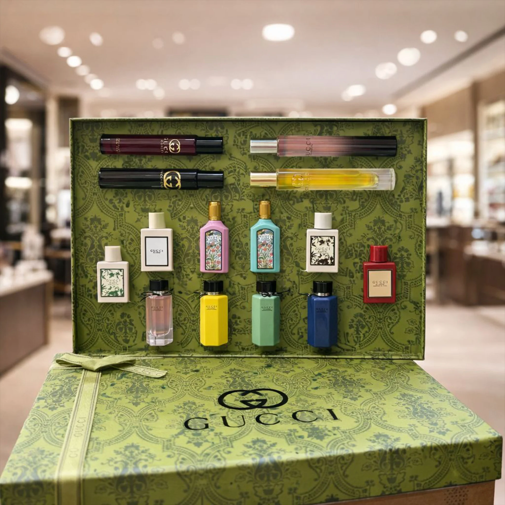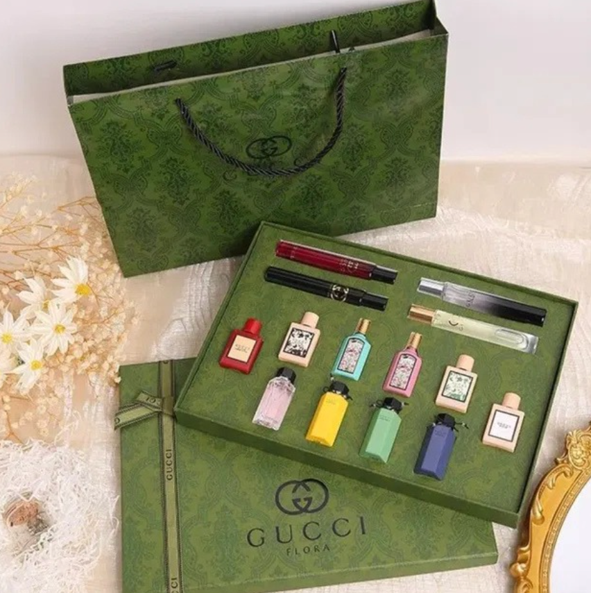 Discover the elegant Gu.cci Mini Perfume Gift Set, featuring a selection of beautifully designed miniature fragrances arranged in a stylish green presentation box. Each bottle offers a unique scent and distinctive design, perfect for exploring different fragrances or adding to your collection. The set also comes with a matching gift bag, making it an ideal choice for gifting on special occasions. 🎁✨