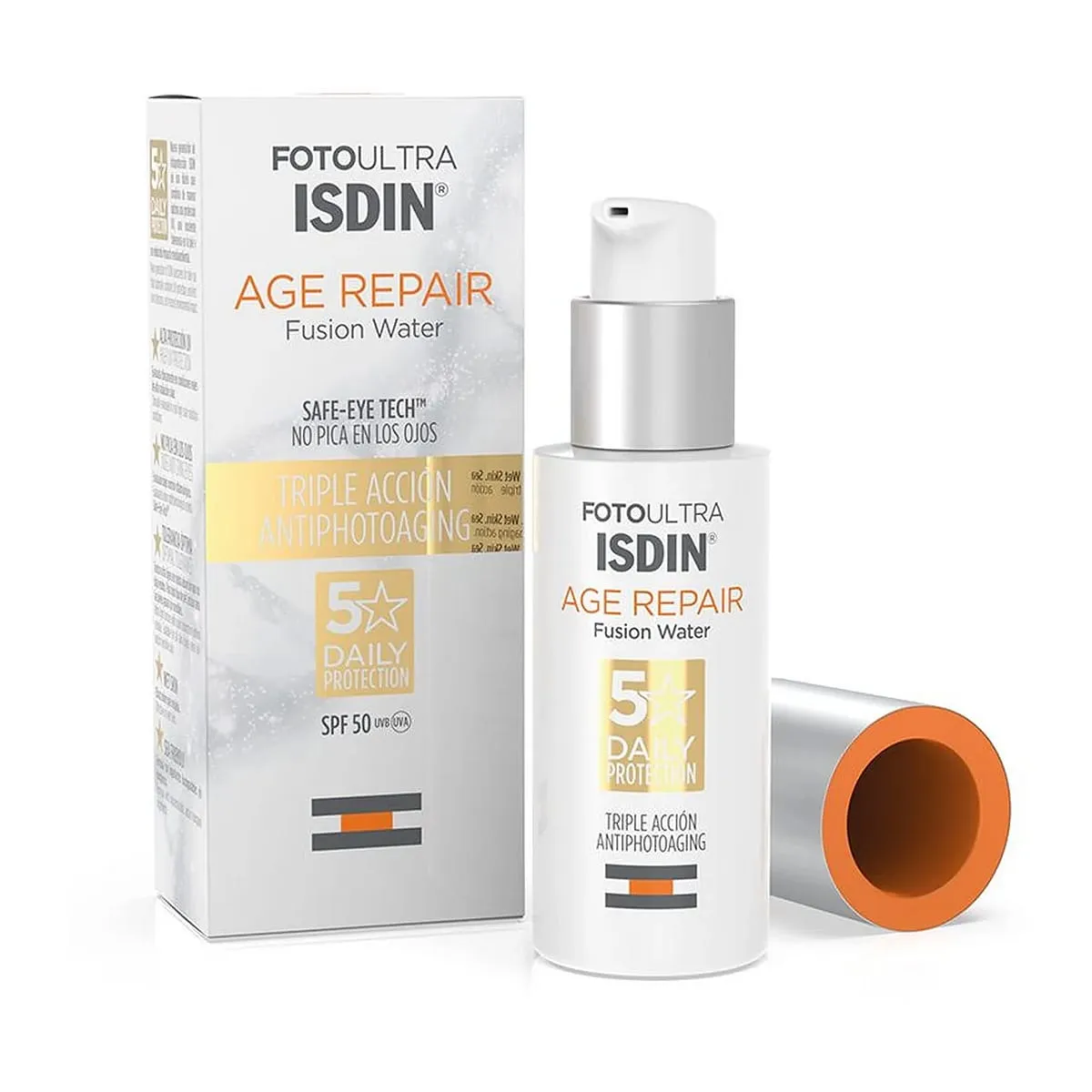 ISDIN Age Repair Fusion Water is a lightweight, multi-benefit sunscreen and anti-aging product designed to provide protection from both UV rays and environmental stressors. This product is part of ISDIN’s Age Repair line, known for its innovative approach to skincare with a focus on preventing and repairing visible signs of aging. Leaves no white cast or residue, making it perfect for daily wear and ideal as a primer under makeup