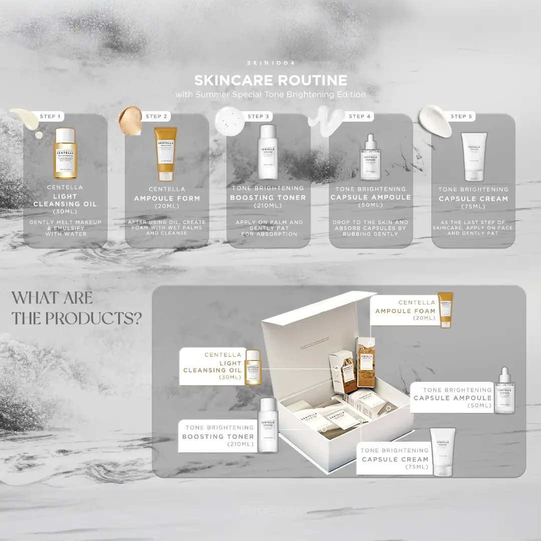 The SKIN1004 Centella Summer Special Tone Brightening Edition is a limited-edition skincare set designed to revitalize and brighten dull, tired skin during the warmer months. Powered by the soothing properties of Centella Asiatica extract and infused with brightening agents like niacinamide, this edition targets uneven skin tone, dullness, and redness. Perfect for sensitive skin, this collection offers both hydration and clarity, making it ideal for a glowing summer complexion.