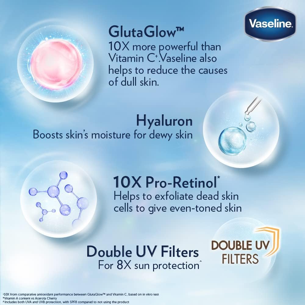 • Boosted with GlutaGlow technology, which is 10X more powerful than Vitamin C+. Vaseline also helps to reduce the causes of dull skin