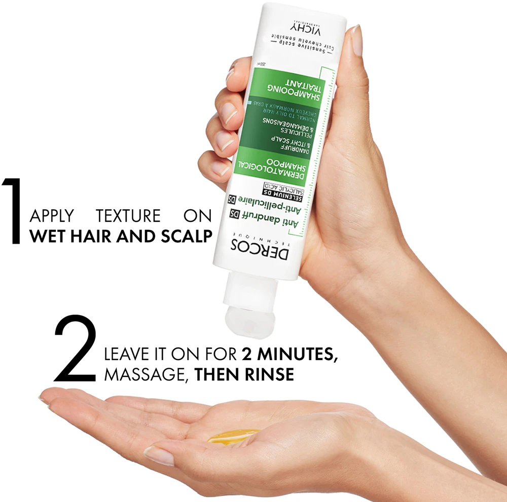 Szampon Vichy Dercos Anti-Dandruff stosuj intensywnie trzy razy w tygodniu przez 4 tygodnie. Następnie przejdź do fazy utrzymania, aplikując raz w tygodniu, by zapobiec nawrotom. Nałóż szampon na mokre włosy i skórę głowy, pozostaw na 2 minuty, wmasuj, a następnie spłucz dokładnie.